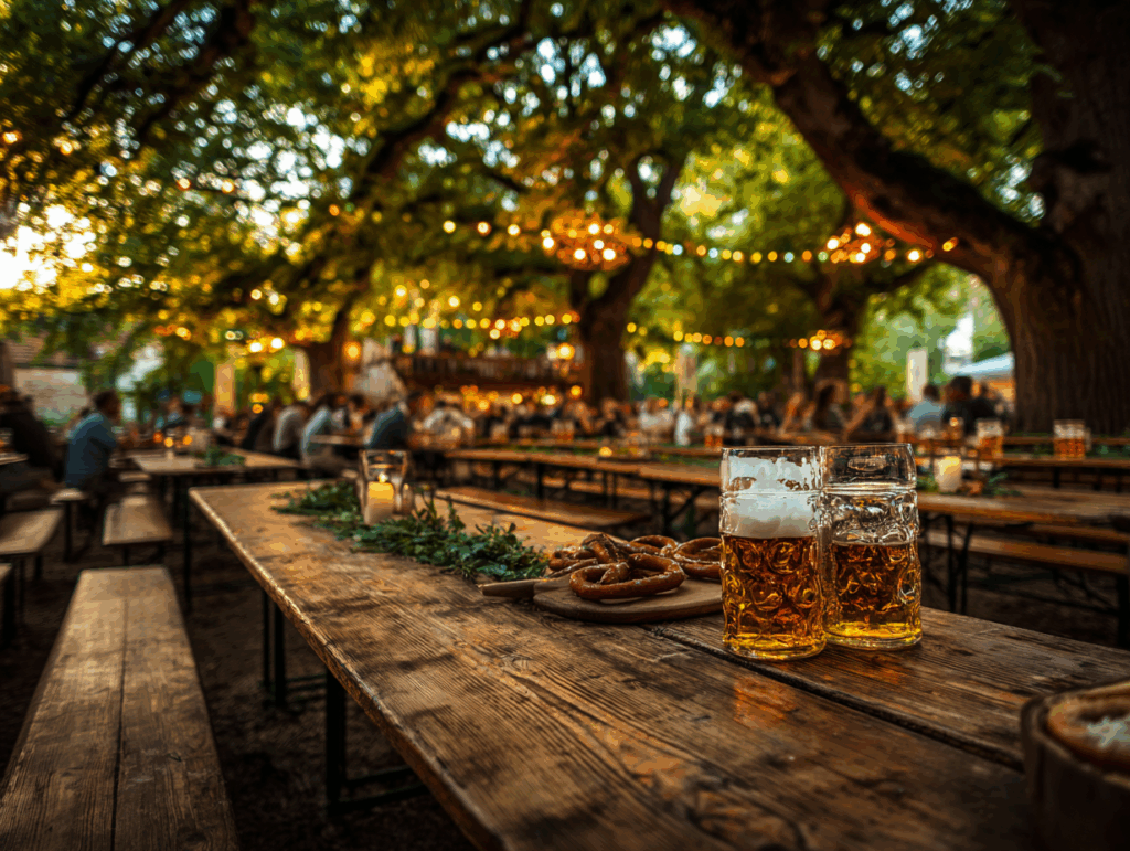 Unter alten Kastanien schmeckt’s am besten: Brotzeiten, frisch gezapftes Bier und laue Abende im Lichterglanz.